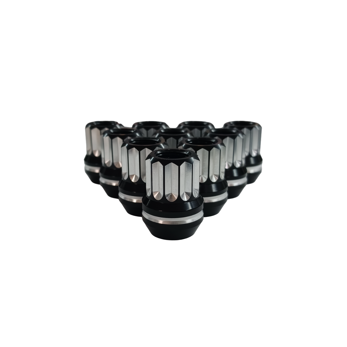 Billet Aluminum 12pt Lug Nuts - M12X1.50 Acorn Black Machined are manufactured from domestic 7075 material and come black anodized with a machined contrast cut offering a great complement to your race car's racing wheels.